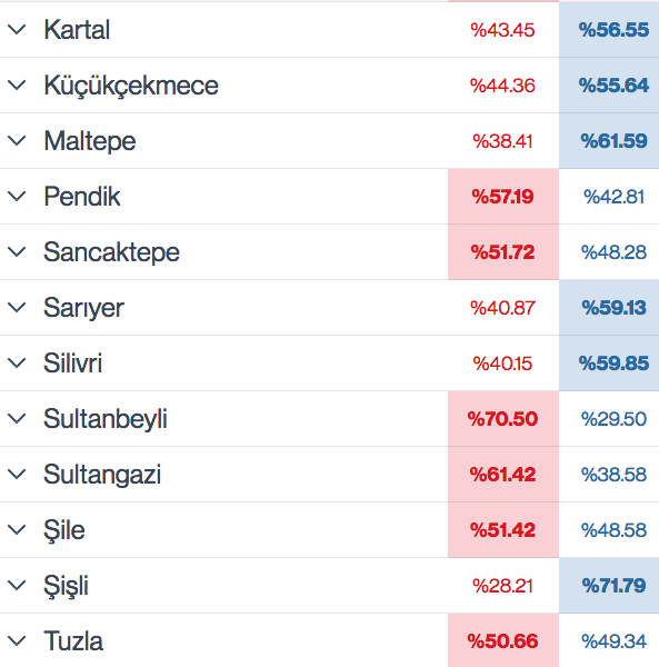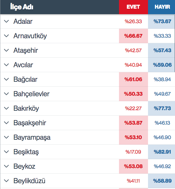 İSTANBUL İLÇELERİ 16 NİSAN REFERANDUM SONUÇLARI