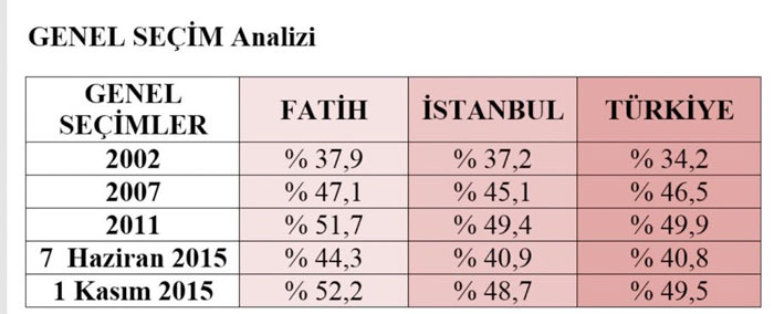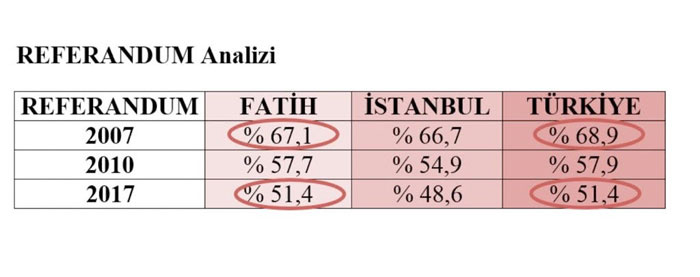 16 Nisan referandum sonuçları Fatih'te yüzde 51.4 EVET çıkmıştı. Türkiye geneli sonuçlarına bakıldığında Fatih ile geneldeki oy oranı birebir aynı.