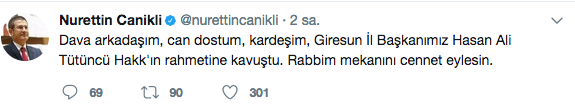 Milli Savunma Bakanı Nurettin Canikli, sosyal medya hesabından yaptığı paylaşımda, "Dava arkadaşım, can dostum, kardeşim, Giresun İl Başkanımız Hasan Ali Tütüncü Hakk'ın rahmetine kavuştu. Rabb'im mekanını cennet eylesin." ifadesini kullandı.