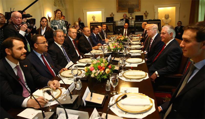 Cumhurbaşkanı Recep Tayyip Erdoğan (sol 4), Beyaz Saray Oval Ofis'te ABD Başkanı Donald Trump (sağ 3) ile baş başa görüştü. Cumhurbaşkanı Erdoğan, Trump tarafından onuruna verilen öğle yemeğine iştirak etti. Yemeğe Genelkurmay Başkanı Orgeneral Hulusi Akar (sol 3), Adalet Bakanı Bekir Bozdağ (sol 2), Dışişleri Bakanı Mevlüt Çavuşoğlu (sol 5), Ekonomi Bakanı Nihat Zeybekci (sol 6), Enerji ve Tabii Kaynaklar Bakanı Berat Albayrak (solda), Milli Savunma Bakanı Fikri Işık (sol 7), MİT Müsteşarı Hakan Fidan (sol 8) ve Cumhurbaşkanlığı Genel Sekreter Yardımcısı ve Sözcüsü Büyükelçi İbrahim Kalın (sol 9) ile ABD Dışişleri Bakanı Rex Tillerson (sağ 2) da katıldı.