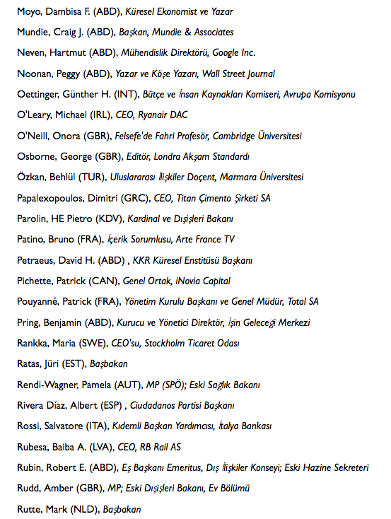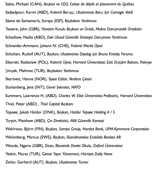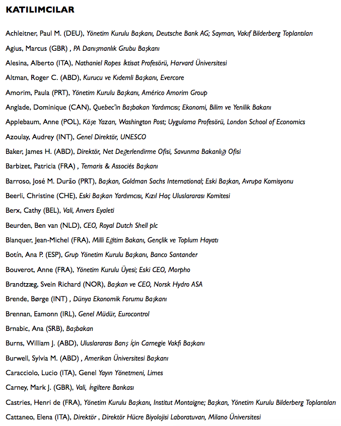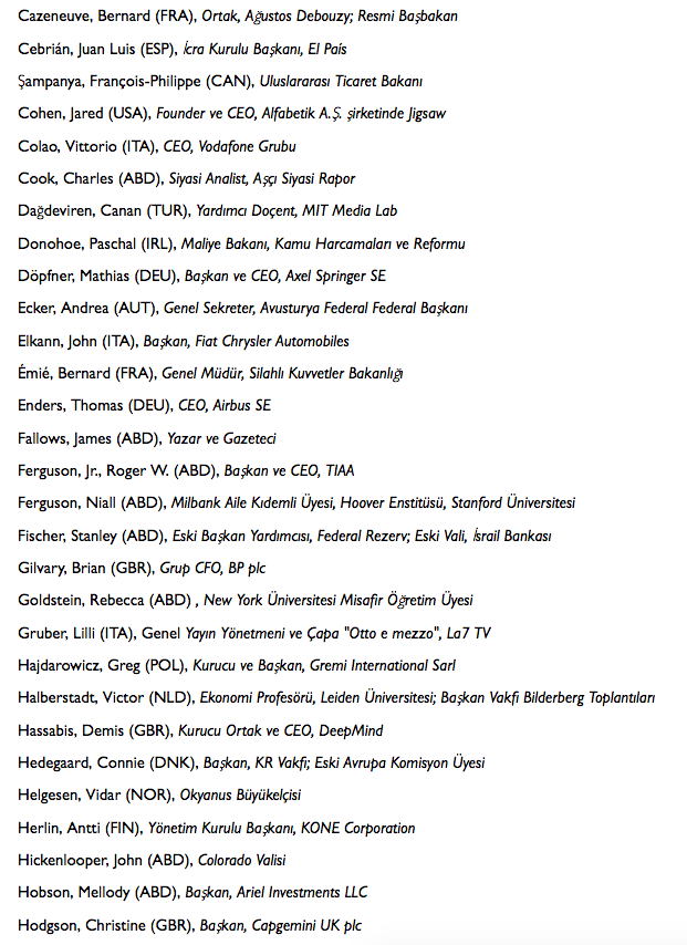 TÜRKİYE'DEN KİMLER DAVETLİ : Bilderberg toplantısına Türkiye'den de Massachusetts Teknoloji Enstitüsü de (MIT) akademisyenlik yapan fizik mühendisi Canan Dağdeviren, Koç Holding Başkanı Ömer Koç, Marmara Üniversitesi Uluslararası İlişkiler bölümünde görevli Doç. Dr. Behlül Özkan, Başbakan Yardımcısı Mehmet Şimşek ile Hürriyet Daily News genel yayın yönetmeni Murat Yetkin davet edildi.