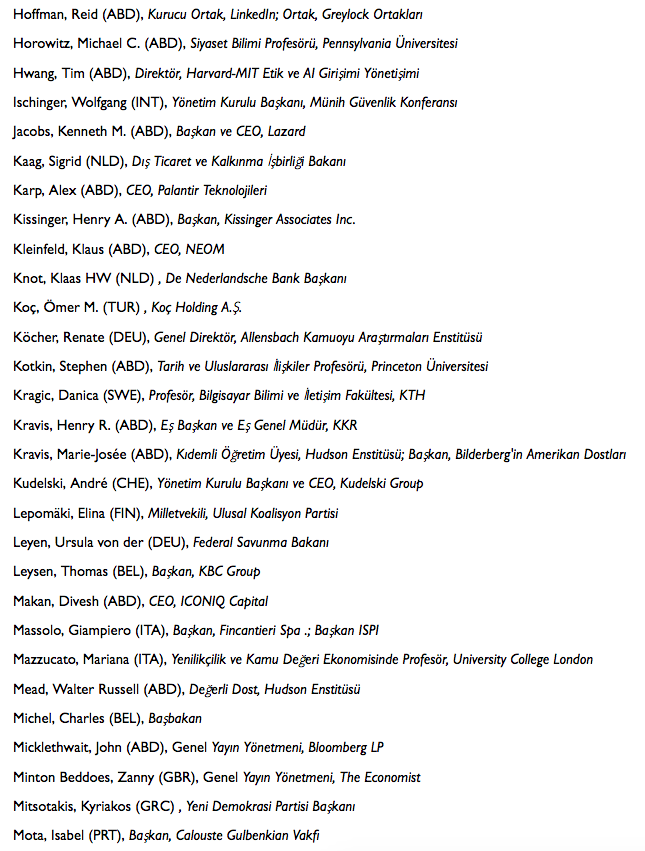Organizasyonun bu seneki katılımcıları arasında Sırbistan Başbakanı Ana Brnabic, Belçika Başbakanı Charles Michel, Estonya Başbakanı Jüri Ratas, Hollanda Başbakanı Mark Rutte gibi siyasetçilerin, Vodafone CEO'su Vittorio Colao, Total CEO'su Patrick Pouyanné, Fiat-Chrysler Grubu Başkanı John Elkann, İsrail Bankası'nın eski yöneticilerinden Stanley Fischer gibi iş dünyasından isimler bulunuyor.