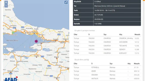 Afet ve Acil Durum Yönetimi Başkanlığı (AFAD) verilerine göre, saat 18.11'de Yalova Çınarcık açıklarında Richter ölçeğine göre 3,3 büyüklüğünde deprem meydana geldi.