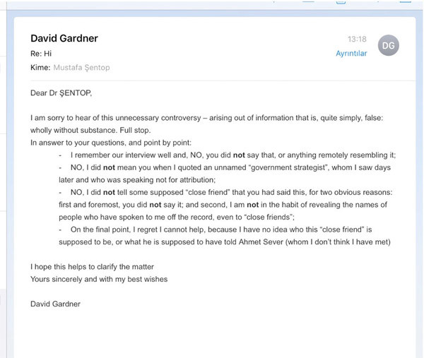 Gardner ile yaptığı görüşmenin bir çok kişinin bulunduğu ortamda yapıldığını ve tanıkları olduğunu belirten Mustafa Şentop, kitaptaki olayı David Gardner'a da sorduğunu söyledi. Gardner'ın verdiği yanıtı paylaşan Şentop, ünlü gazetecinin Ahmet Sever'in iddiasını yalanladığını söyledi.