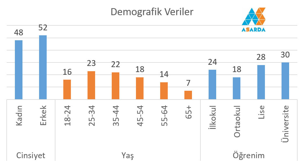 Katılımcıların demografik veriler grafikte verildiği gibidir.CUMHUR İTTİFAKININ OY ORANI NE KADAR?.. 24 Haziranda Cumhur İttifakının taban oyu yüzde 49 bandında gözükürken, kararsızların oransal dağılımı ile Cumhur İttifakı'nın oy oranı yüzde 55-56 bandına çıkıyor.