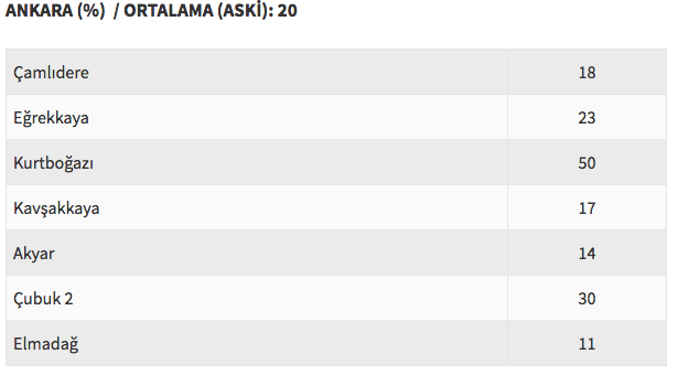 Ankara’da bulunan 7 barajın doluluk oranında da ciddi oranda düşüş yaşandı. Çamlıdere Barajı yüzde 18, Eğrekkaya Barajı yüzde 23, Kurtboğazı Barajı yüzde 50, Kavşakkaya Barajı yüzde 17, Akyar Barajı yüzde 14, Çubuk-2 Barajı yüzde 30, Elmadağ Kargalı Barajı yüzde 11 seviyelerine kadar geriledi. 7 barajın genel doluluk oranı ise yüzde 20 oranına kadar indi.